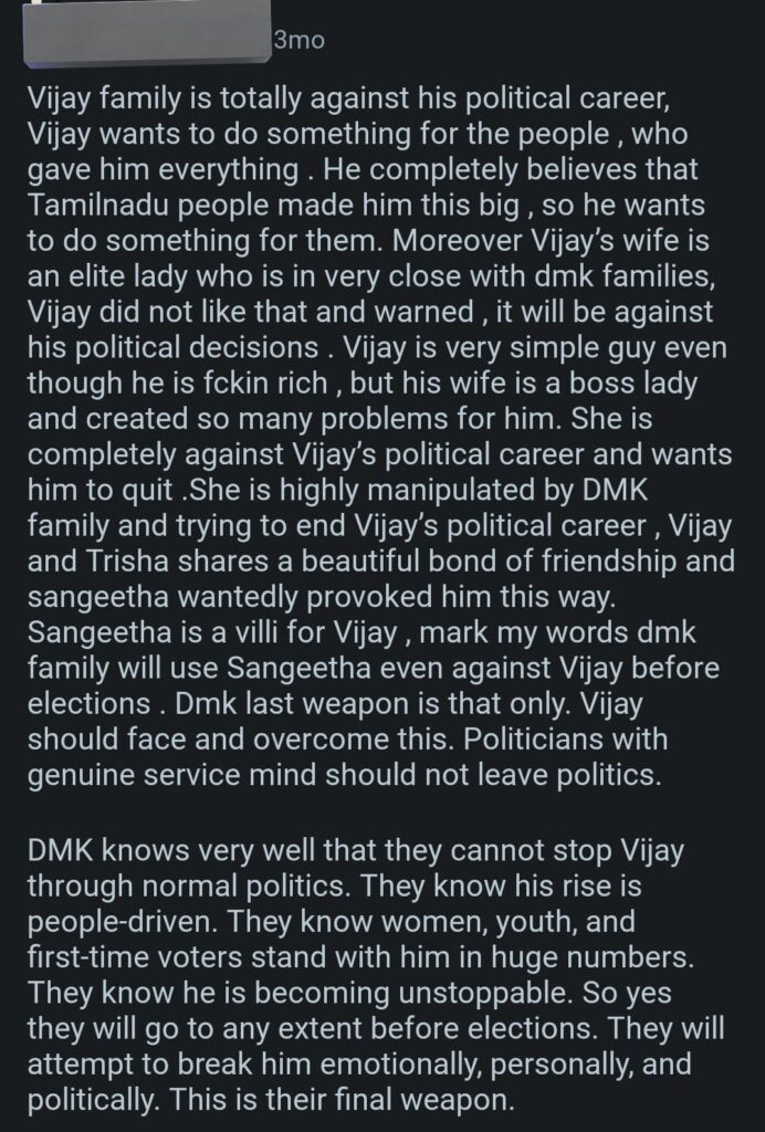 Friendship between Vijay and Trisha, which Sangeetha reportedly used to upset him. The message warns that the DMK cannot beat Vijay in a normal way because the youth and women support him. Because they can’t stop his popularity, they are trying to break him emotionally and personally using his family issues as a final weapon.